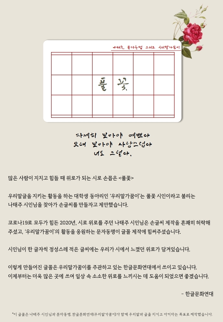 방향이 정해지자마자 바로 공주풀꽃문학관에 연락해 나태주 시인님의 손글씨를 만들고 싶다고 제안합니다.