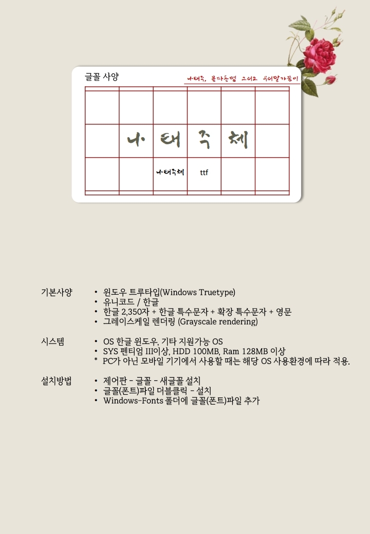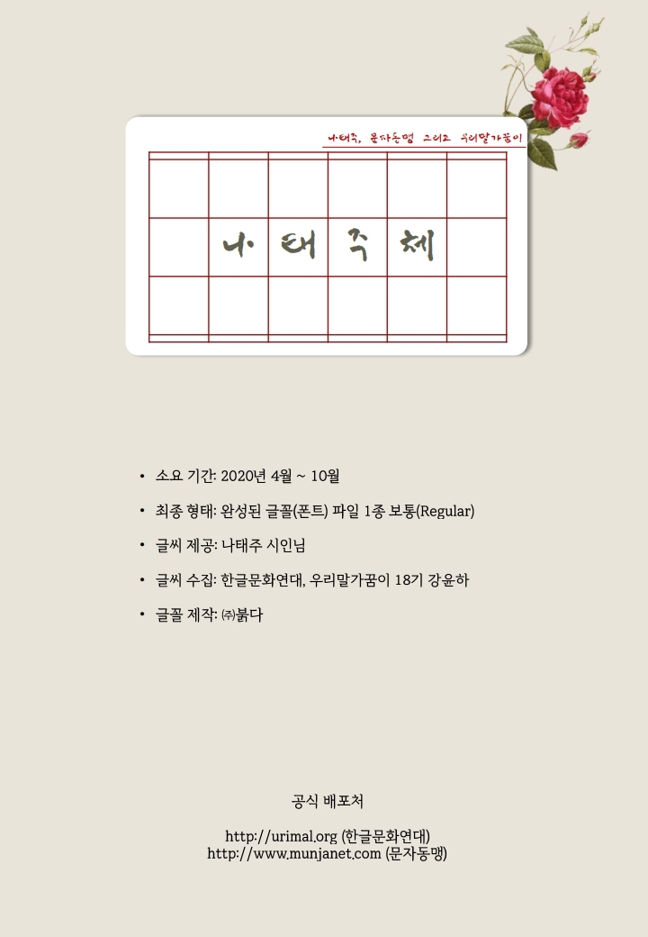 이런 노력들로 만들어진 나태주체를 배포합니다. 나태주 시인님이 제공해주신 손글씨와 우리말글 사랑에 힘써준 문자동맹의 도움을 받아 세상에 나오게 되었습니다.
