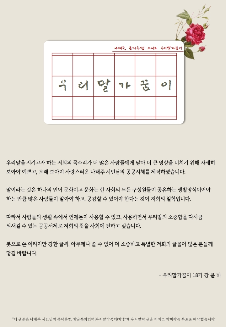 | [우리말가꿈이 21기 - (주)붉다 협업 활동] 세계인한글글씨대회 최종 수상작 발표 (0) | 2023.05.16 |