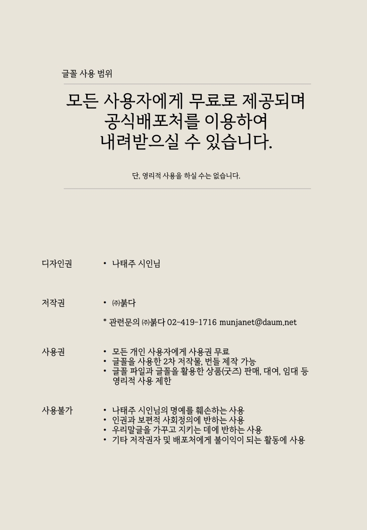 글꼴을 내려받으면 있는 '글꼴 안내' 파일이나 아래의 내용을 꼭 읽으신 뒤 사용해주세요.