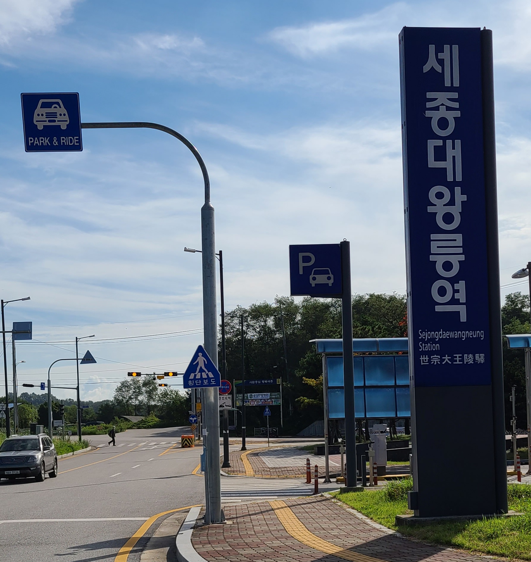경기도 여주시에 있는 세종대왕릉역 1번 출구 앞에는 주차장을 알리는 안내판에 ‘PARK & RIDE’라는 외국어가 적혀 있습니다.