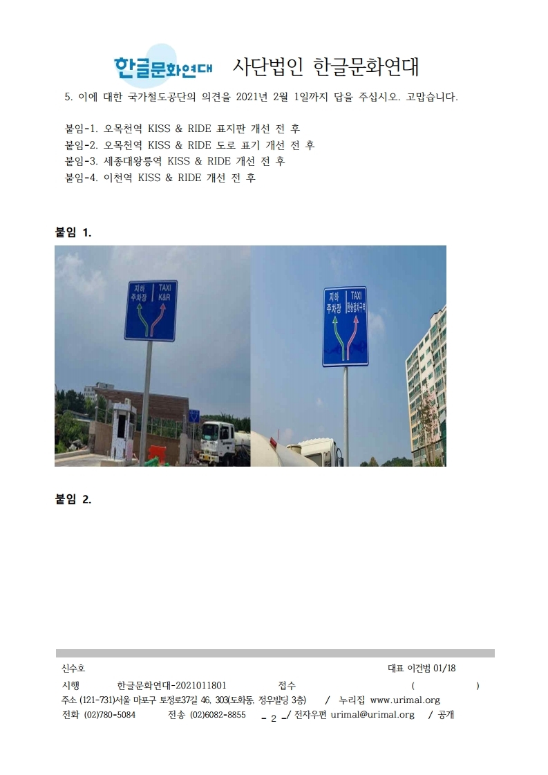 2) 만일 새 역을 짓는 과정에서 지자체와 함께 역 주변의 시설 설치를 상의한다면 ‘Kiss & Ride’ 대신 우리 국민 누구나 알아들을 수 있는 ‘배웅정차장, 환승정차구역’ 등의 용어를 사용하도록 적극 제안해 주십시오.