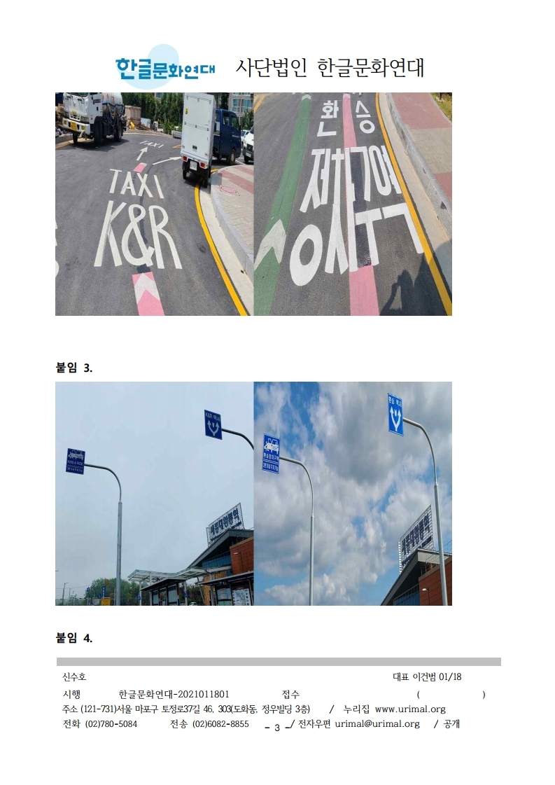 3. 2017년 7월에 경기도 용인에 거주하는 시민의 제보를 받아서 신분당선 동천역에 표시되어 있던 키스 앤 라이드 바닥(노면) 표시와 안내판을 처음 알게 되었고, 이를 용인시청 도로과에 고쳐달라고 요구해서 2018년 3월 초에 ‘환승정차구역’이라는 이름으로 바꾸었습니다. 그 후에도 우리 연대에서 분기별로 활동하고 있는 대학생 동아리 우리말가꿈이와 함께 광교중앙역, 탄현역, 여주역, 강매역, 곤지암역, 초월역, 영종역, 삼동역, 경기광주역, 세종대왕릉역, 오목천역 등 의 키스 앤 라이드 표기를 우리말로 고치는 활동을 계속했습니다. (붙임 참조) 한 시민은 키스 앤 라이드라는 이름을 들으니 마치 유흥주점 이름 같다고 말하기도 했습니다.