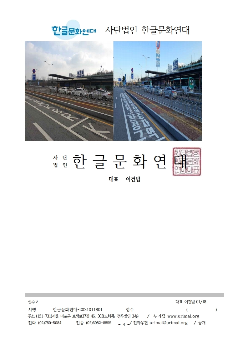 3. 2017년 7월에 경기도 용인에 거주하는 시민의 제보를 받아서 신분당선 동천역에 표시되어 있던 키스 앤 라이드 바닥(노면) 표시와 안내판을 처음 알게 되었고, 이를 용인시청 도로과에 고쳐달라고 요구해서 2018년 3월 초에 ‘환승정차구역’이라는 이름으로 바꾸었습니다. 그 후에도 우리 연대에서 분기별로 활동하고 있는 대학생 동아리 우리말가꿈이와 함께 광교중앙역, 탄현역, 여주역, 강매역, 곤지암역, 초월역, 영종역, 삼동역, 경기광주역, 세종대왕릉역, 오목천역 등 의 키스 앤 라이드 표기를 우리말로 고치는 활동을 계속했습니다. (붙임 참조) 한 시민은 키스 앤 라이드라는 이름을 들으니 마치 유흥주점 이름 같다고 말하기도 했습니다.