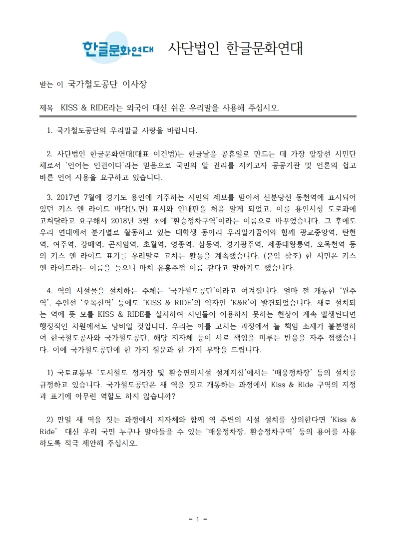 2) 만일 새 역을 짓는 과정에서 지자체와 함께 역 주변의 시설 설치를 상의한다면 ‘Kiss & Ride’ 대신 우리 국민 누구나 알아들을 수 있는 ‘배웅정차장, 환승정차구역’ 등의 용어를 사용하도록 적극 제안해 주십시오.