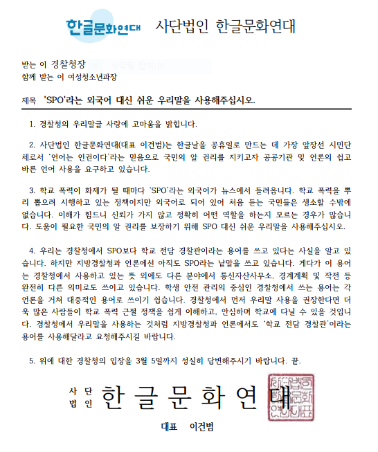 3. 학교 폭력이 화제가 될 때마다 ‘SPO’라는 외국어가 뉴스에서 들려옵니다. 학교 폭력을 뿌리 뽑으려 시행하고 있는 정책이지만 외국어로 되어 있어 처음 듣는 국민들은 생소할 수밖에 없습니다. 이해가 힘드니 신뢰가 가지 않고 정확히 어떤 역할을 하는지 모르는 경우가 많습니다. 도움이 필요한 국민의 알 권리를 보장하기 위해 SPO 대신 쉬운 우리말을 사용해주십시오.