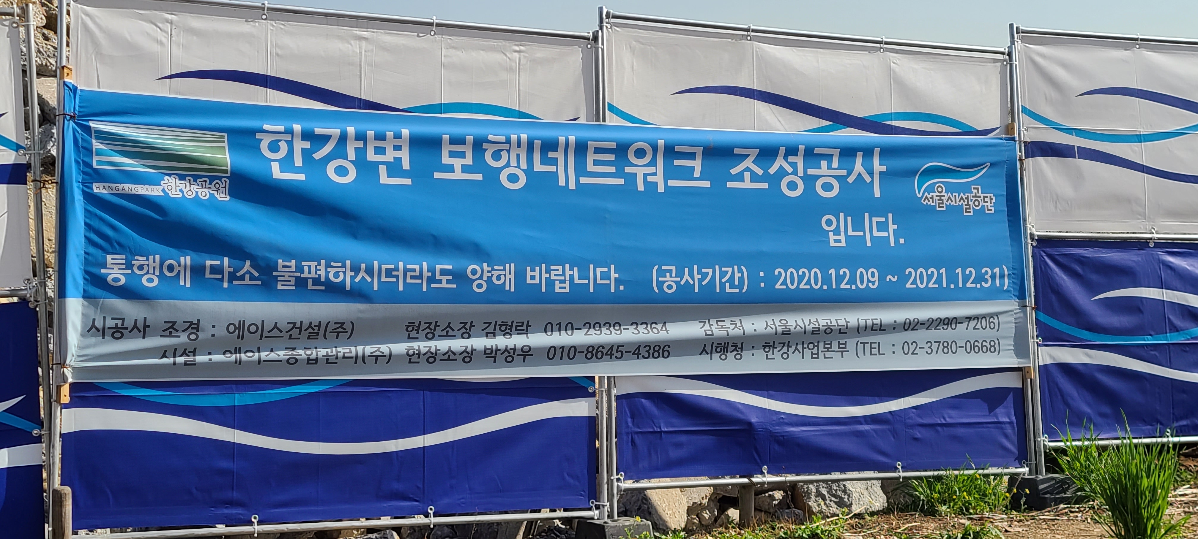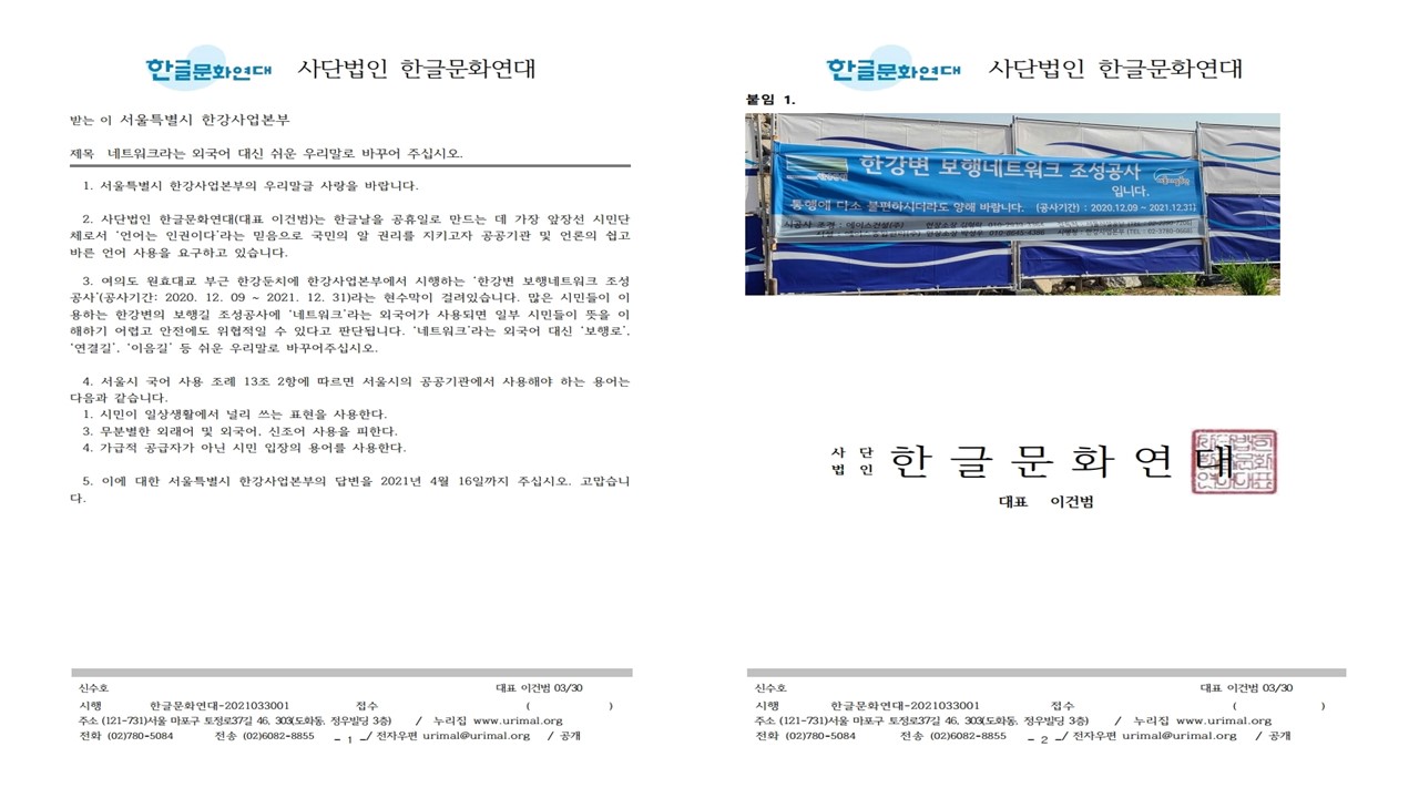 3. 여의도 원효대교 부근 한강둔치에 한강사업본부에서 시행하는 ‘한강변 보행네트워크 조성공사’(공사기간: 2020. 12. 09 ~ 2021. 12. 31)라는 현수막이 걸려있습니다. 많은 시민들이 이용하는 한강변의 보행길 조성공사에 ‘네트워크’라는 외국어가 사용되면 일부 시민들이 뜻을 이해하기 어렵고 안전에도 위협적일 수 있다고 판단됩니다. ‘네트워크’라는 외국어 대신 ‘보행로’, ‘연결길’, ‘이음길’ 등 쉬운 우리말로 바꾸어주십시오.