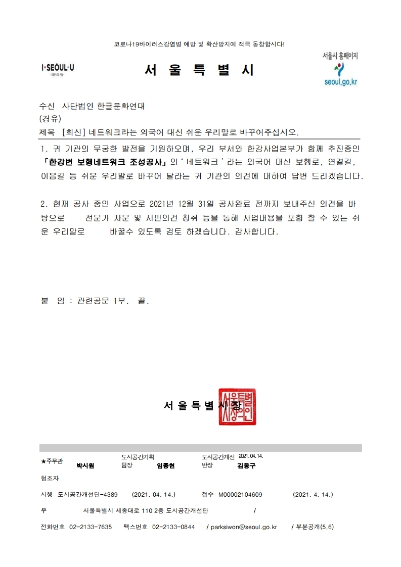 1 . 귀 기관의 무궁한 발전을 기원하오며 , 우리 부서와 한강사업본부가 함께 추진중인 「한강변 보행네트워크 조성공사」의 ‘ 네트워크 ’ 라는 외국어 대신 보행로 , 연결길 , 이음길 등 쉬운 우리말로 바꾸어 달라는 귀 기관의 의견에 대하여 답변 드리겠습니다 .