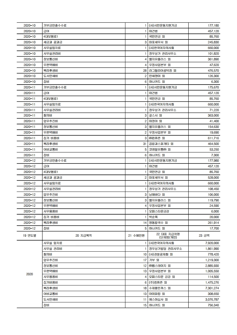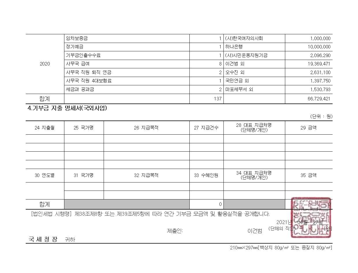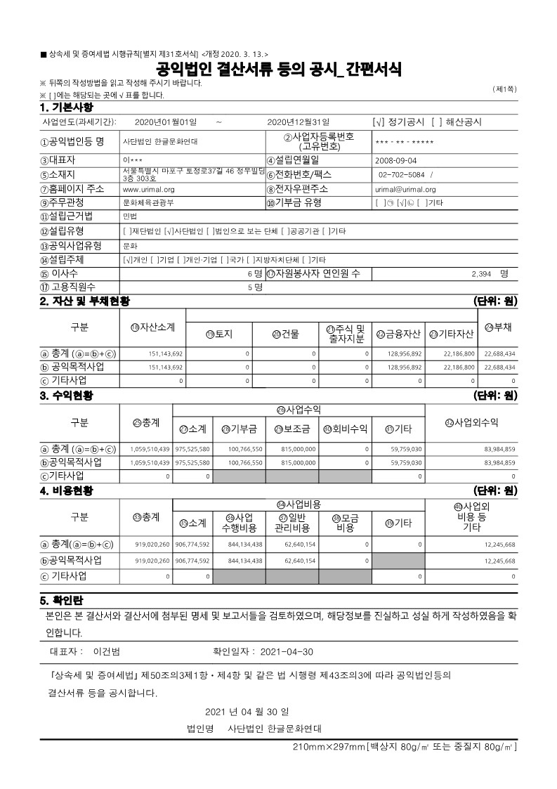 한글문화연대의 2020년 공익법인 결산서류 등의 공시 및 기부금 활용실적 명세서를 '아래'와 같이 공유합니다. 국세청 홈택스(www.hometax.go.kr/)에서도 확인하실 수 있습니다. (국세청 홈택스 – 공익법인 결산서류 공시 – 공시/공개 열람하기 – 공익법인 결산서류 등 공시 – [한글문화연대]로 조회)