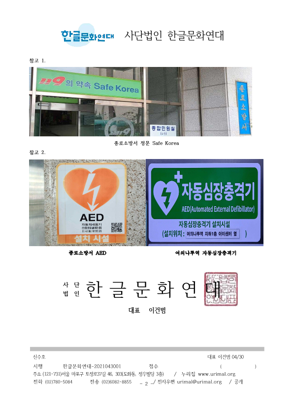 3. 종로소방서 정문과 후문에 쓰여 있는 Safe Korea라는 구호를 우리말 구호로 바꿔 써 주십시오. 한글문화연대에서는 시민의 제보를 받아 Safe Korea 구호에 대해 2021년 4월 9일 소방청에 문의하였으며, 소방청에서는 “119의 약속 Safe Korea라는 외국어 구호 대신 ‘국민 중심의 안전가치에 일상의 안심을 더합니다.’라는 우리말 구호로 바꾸어 사용하고 있다. 2020년, 전국 소방서에 우리말 구호로 바꿔쓰라고 공문을 보냈다.”라고 답하였습니다. 실제로 서울 시내 많은 소방서에 Safe Korea 구호가 없는 것을 확인하였습니다.