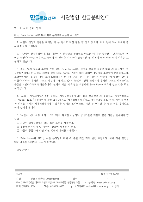 6. Safe Korea와 AED를 쉬운 우리말로 바꿔 써 주실 것을 다시 한번 요청하며, 이에 대한 답변을 2021년 5월 14일까지 주시기 바랍니다.