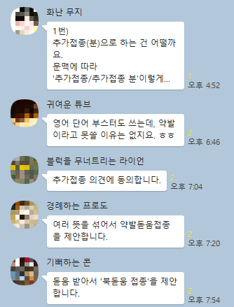 '부스터 샷'이라는 외국어를 대신할 우리말로 '추가접종/추가접종(분)'이 뽑혔다. 공공기관이나 언론이 사용하는 어려운 말을 쉬운 말로 다듬기 위해 꾸려진 한글문화연대 말모이 모임이 4월 26일부터 5월 3일까지 '부스터 샷'의 쉬운 우리말을 논의한 결과였다.