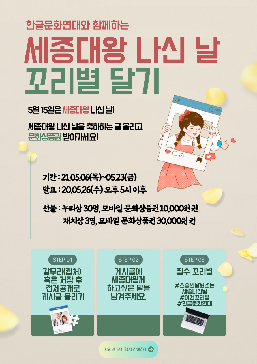 한글문화연대 세종대왕 나신 날 축하그림을 개인 누리소통망(인스타그램, 페이스북) 계정에 올리고, 세종대왕님께 하고 싶은 한마디와 필수 꼬리별(해시태그)을 남겨 주면 끝!