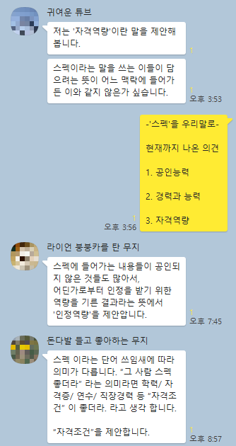 '스펙'을 대신할 말로 총 14개 단어가 거론되었고 5월 11일부터 5월 13일까지 24명이 투표한 결과 '깜냥'이 8표를 받았고 '인정역량'이 7표를 얻어 과반수를 넘지 못해 최종 투표를 하기로 결정되었다. 5월 14일 1위와 2위를 한 '깜냥'과 '인정역량' 단어로 최종 투표를 하여 5월 17일 '인정역량'이 17표 '깜냥'이 5표를 얻어 최종으로 선정된 단어는 '인정역량'이 되었다. 이 중 색다른 말이라 할 수 있는 '역량갖춤새'를 제안한 한규석님은 갖춤새의 사전 풀이가 "갖추거나 마련하여 차린 형편이나 모양새"로 나와있어 목표를 위해 무언가를 갖추는 것을 의미하게 만들었다고 한다.