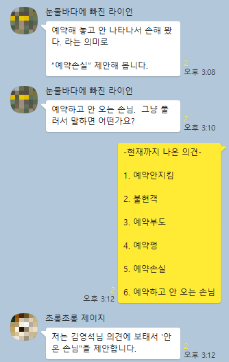 '노쇼'를 대신할 말로 총 8개 단어가 거론되었고 5월 25일부터 5월 27일까지 23명이 투표한 결과 '예약펑'이 5표를 받았고 '예약 어김'이 15표를 얻어 최종적으로 '예약 어김'이 선정되었다. 이 중 '예약펑'을 제안한 김성수 님은 연기처럼 사라짐을 표현하는 의성어 '펑'을 예약에 붙여 약속이 깨져서 '펑' 소리나는 것을 표현했다고 하며 재치 있는 의견을 내주셨다.
