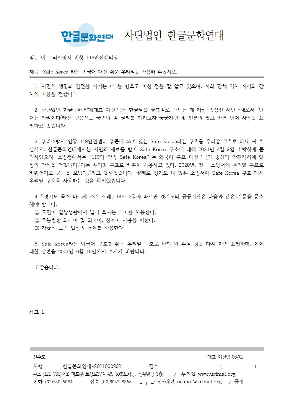 | [공문] Safe Korea라는 외국어 대신 쉬운 우리말을 사용해 주십시오. (0) | 2021.06.10 |