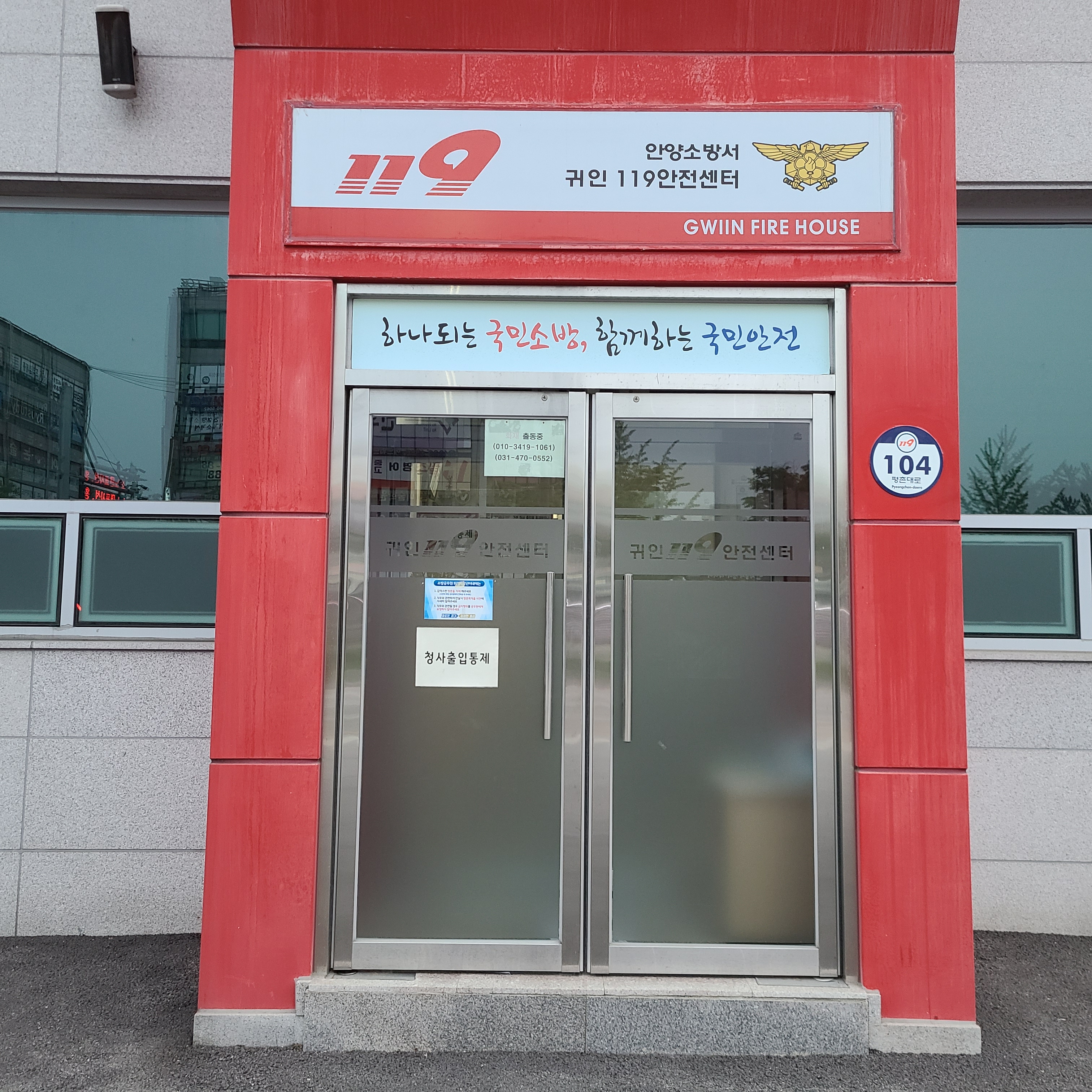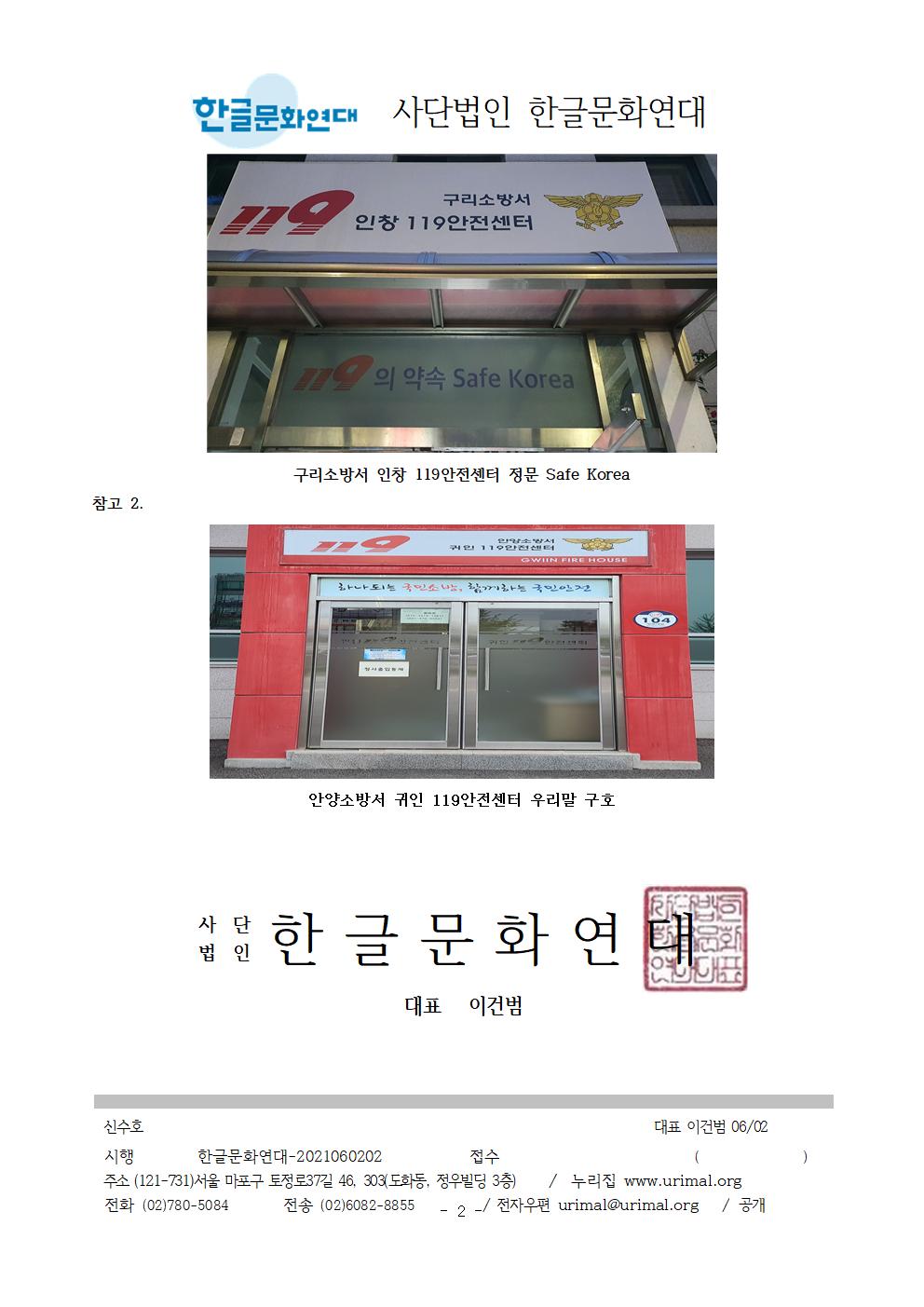 3. 구리소방서 인창 119안전센터 정문에 쓰여 있는 Safe Korea라는 구호를 우리말 구호로 바꿔 써 주십시오. 한글문화연대에서는 시민의 제보를 받아 Safe Korea 구호에 대해 2021년 4월 9일 소방청에 문의하였으며, 소방청에서는 “119의 약속 Safe Korea라는 외국어 구호 대신 ‘국민 중심의 안전가치에 일상의 안심을 더합니다.’라는 우리말 구호로 바꾸어 사용하고 있다. 2020년, 전국 소방서에 우리말 구호로 바꿔쓰라고 공문을 보냈다.”라고 답하였습니다. 실제로 경기도 내 많은 소방서에 Safe Korea 구호 대신 우리말 구호를 사용하는 것을 확인했습니다.