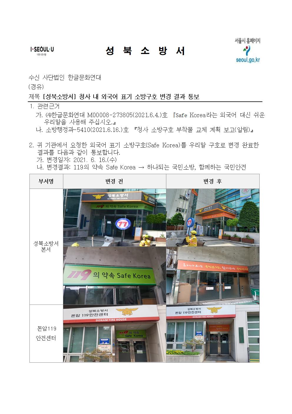 2. 귀 기관에서 요청한 외국어 표기 소방구호(Safe Korea)를 우리말 구호로 변경 완료한 결과를 다음과 같이 통보합니다.