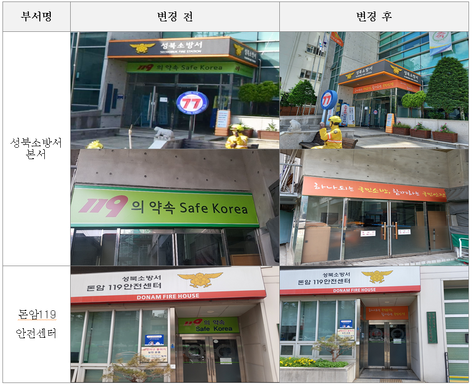 2. 귀 기관에서 요청한 외국어 표기 소방구호(Safe Korea)를 우리말 구호로 변경 완료한 결과를 다음과 같이 통보합니다.