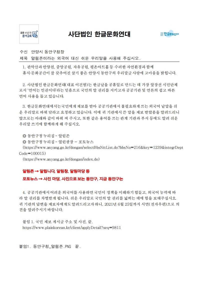 | 알림존이라는 외국어 대신 쉬운 우리말을 사용해 주십시오. | 안양시 동안구 | 2021년 6월 7일 |