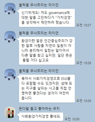 흔히 뉴스에서는 '환경 사회 지배구조'라고 각각의 우리말 번역어를 제시하지만 의미가 다가오지 않아 새로운 우리말로 다듬자고 의견이 모아졌다.