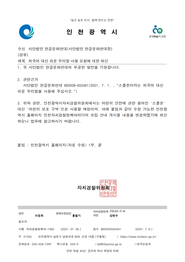 사단법인 한글문화연대 M00008-655461(2021. 7. 1. , "스쿨존이라는 외국어 대신 쉬운 우리말을 사용해 주십시오.")