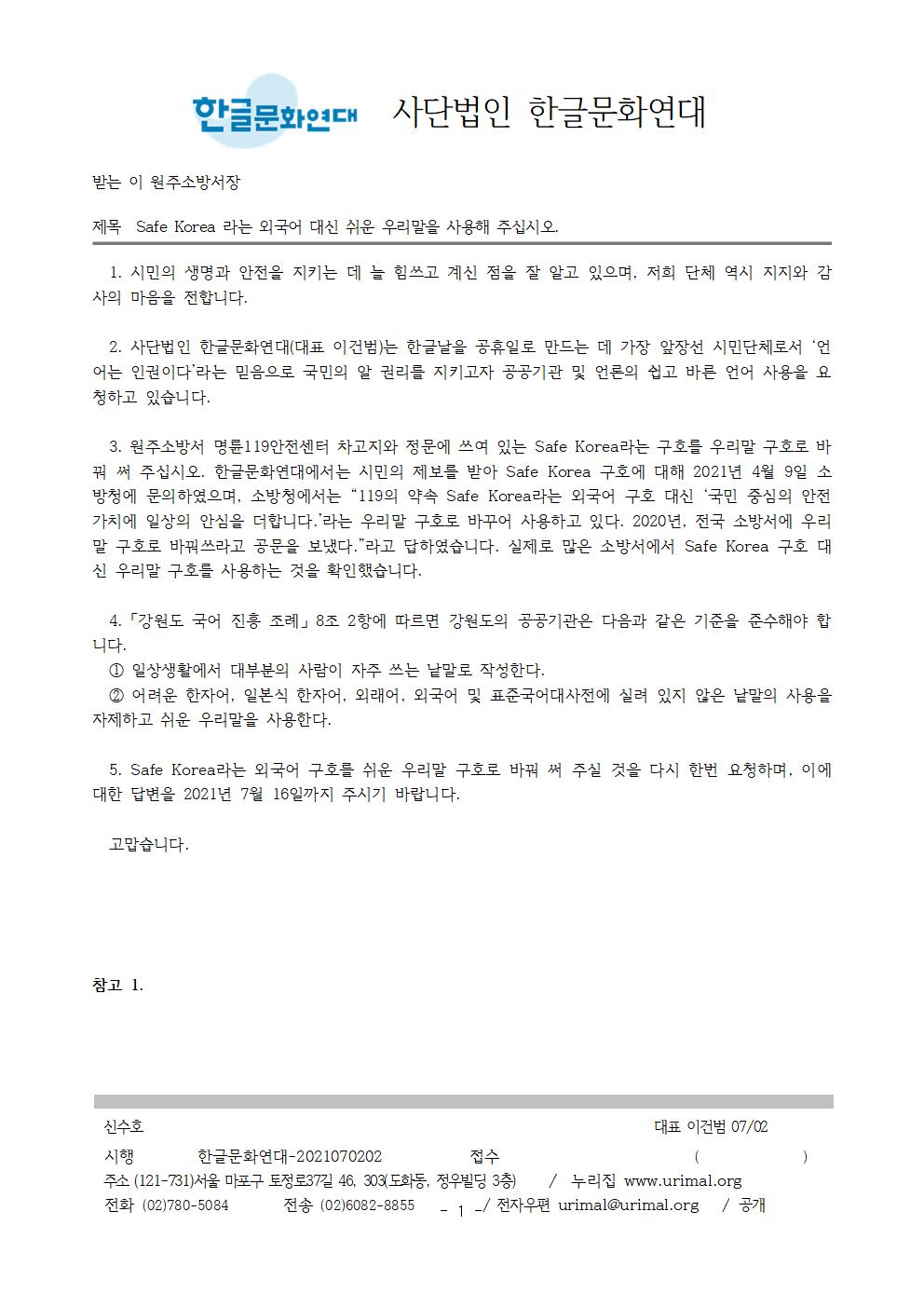 3. 원주소방서 명륜119안전센터 차고지와 정문에 쓰여 있는 Safe Korea라는 구호를 우리말 구호로 바꿔 써 주십시오. 한글문화연대에서는 시민의 제보를 받아 Safe Korea 구호에 대해 202149일 소방청에 문의하였으며, 소방청에서는 “119의 약속 Safe Korea라는 외국어 구호 대신 국민 중심의 안전가치에 일상의 안심을 더합니다.’라는 우리말 구호로 바꾸어 사용하고 있다. 2020, 전국 소방서에 우리말 구호로 바꿔쓰라고 공문을 보냈다.”라고 답하였습니다. 실제로 많은 소방서에서 Safe Korea 구호 대신 우리말 구호를 사용하는 것을 확인했습니다.