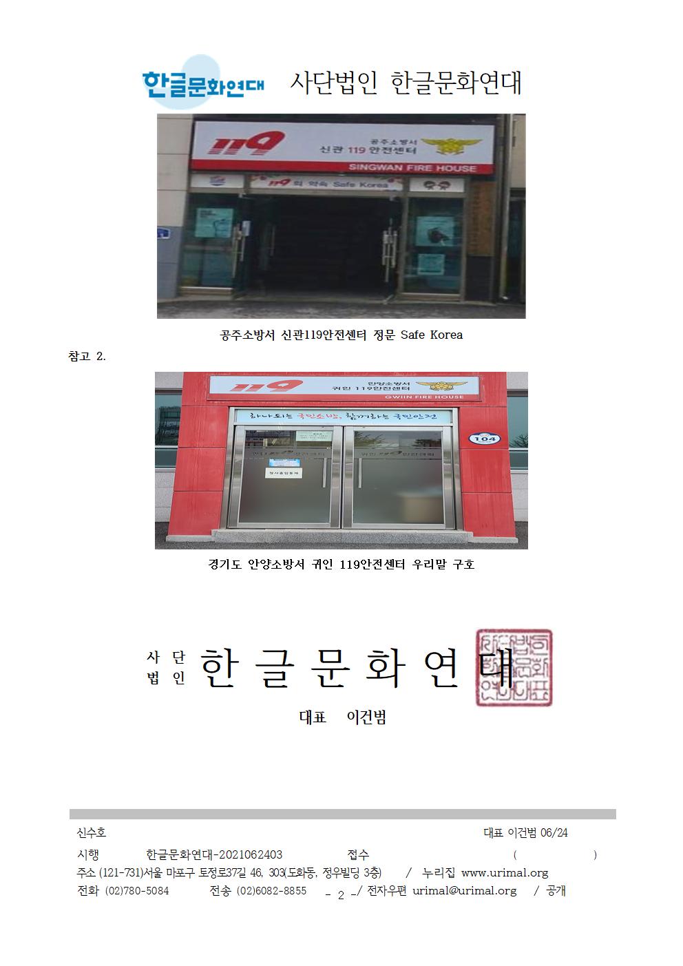 3. 공주소방서 신관119안전센터 정문에 쓰여 있는 Safe Korea라는 구호를 우리말 구호로 바꿔 써 주십시오. 한글문화연대에서는 시민의 제보를 받아 Safe Korea 구호에 대해 2021년 4월 9일 소방청에 문의하였으며, 소방청에서는 “119의 약속 Safe Korea라는 외국어 구호 대신 ‘국민 중심의 안전가치에 일상의 안심을 더합니다.’라는 우리말 구호로 바꾸어 사용하고 있다. 2020년, 전국 소방서에 우리말 구호로 바꿔쓰라고 공문을 보냈다.”라고 답하였습니다. 실제로 전국 많은 소방서에 Safe Korea 구호 대신 우리말 구호를 사용하는 것을 확인했습니다.