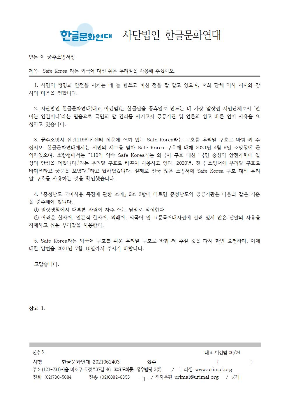 | [공문] Safe Korea라는 외국어 대신 쉬운 우리말을 사용해 주십시오. (0) | 2021.07.22 |
