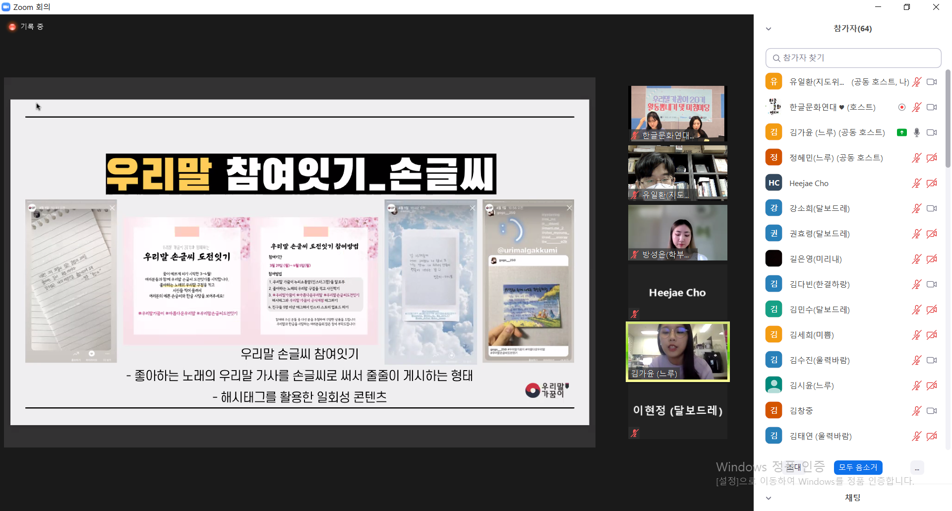 2021년 7월 17일 토요일 오후 2시에 우리말가꿈이 20기 마침마당이 열렸습니다. 지난 19기처럼 면접과 오름마당을 비대면으로 했던 우리말가꿈이 20기 역시 마침마당을 한 주 앞두고 코로나19 확진자가 역대 최다를 갱신하는 추세에 맞추어 마침마당도 비대면으로 진행하게 되었습니다. 총 참여인원은 66명이었습니다.