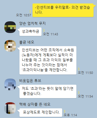 김형주님은 "이건범 대표님이 제안하신 대로, 재물에 관한 내용일 경우 '성과급'을 대체어로 쓸 수 있도록, '장려혜택'과 '성과급' 두 개의 대체어를 선정하는 안을 제안합니다."라고 하셨다.