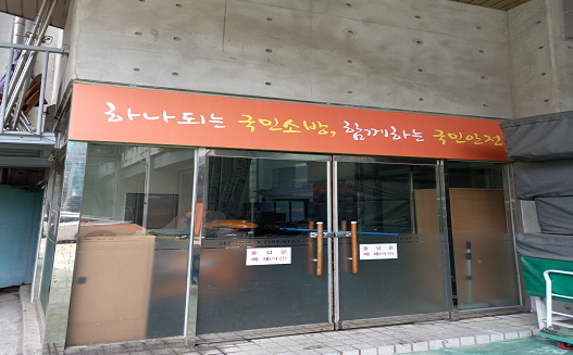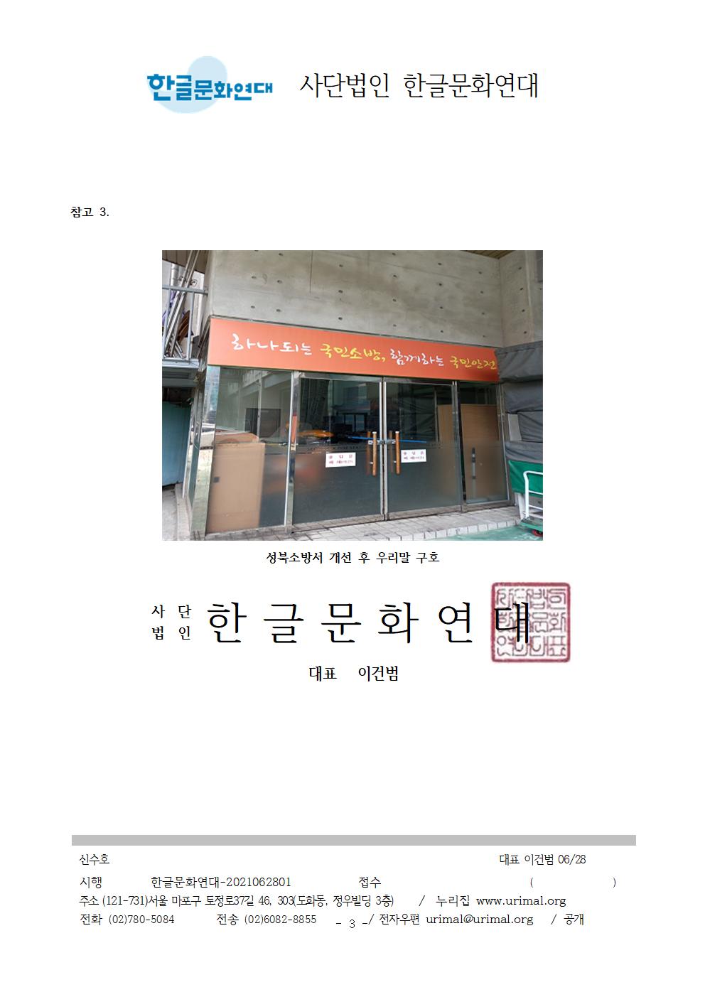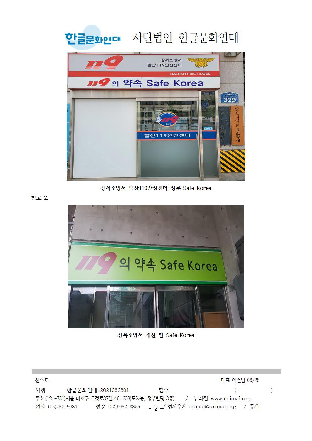 3. 강서소방서 발산119안전센터 정문에 쓰여 있는 Safe Korea라는 구호를 우리말 구호로 바꿔 써 주십시오. 한글문화연대에서는 시민의 제보를 받아 Safe Korea 구호에 대해 2021년 4월 9일 소방청에 문의하였으며, 소방청에서는 “119의 약속 Safe Korea라는 외국어 구호 대신 ‘국민 중심의 안전가치에 일상의 안심을 더합니다.’라는 우리말 구호로 바꾸어 사용하고 있다. 2020년, 전국 소방서에 우리말 구호로 바꿔쓰라고 공문을 보냈다.”라고 답하였습니다. 최근 성북소방서도 우리말 구호로 개선하였으며 전국 많은 소방서에 Safe Korea 구호 대신 우리말 구호를 사용하는 것을 확인했습니다.