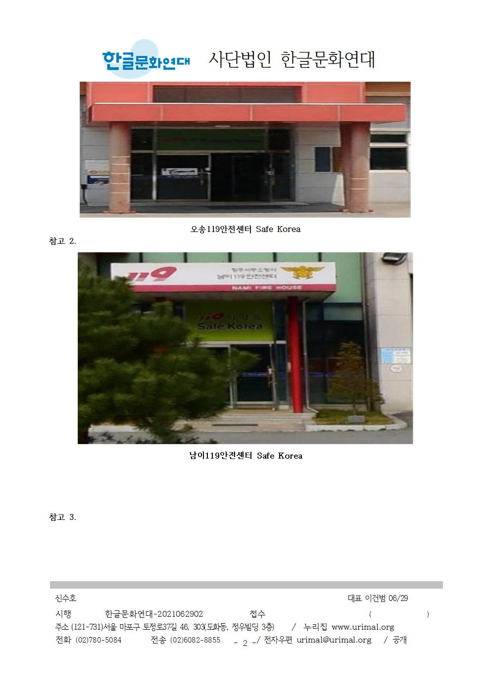 3. 청주서부소방서 오송119안전센터와 남이119안전센터에 쓰여 있는 Safe Korea라는 구호를 우리말 구호로 바꿔 써 주십시오. 한글문화연대에서는 시민의 제보를 받아 Safe Korea 구호에 대해 2021년 4월 9일 소방청에 문의하였으며, 소방청에서는 “119의 약속 Safe Korea라는 외국어 구호 대신 ‘국민 중심의 안전가치에 일상의 안심을 더합니다.’라는 우리말 구호로 바꾸어 사용하고 있다. 2020년, 전국 소방서에 우리말 구호로 바꿔쓰라고 공문을 보냈다.”라고 답하였습니다. 실제로 많은 소방서에서 Safe Korea 구호 대신 우리말 구호를 사용하는 것을 확인했습니다.