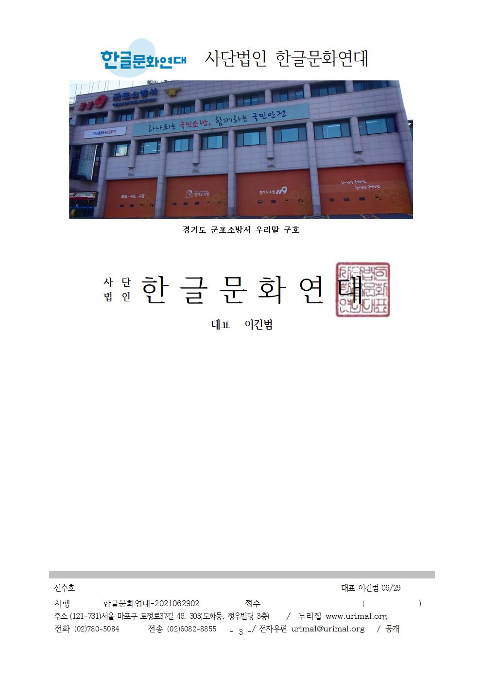 3. 청주서부소방서 오송119안전센터와 남이119안전센터에 쓰여 있는 Safe Korea라는 구호를 우리말 구호로 바꿔 써 주십시오. 한글문화연대에서는 시민의 제보를 받아 Safe Korea 구호에 대해 2021년 4월 9일 소방청에 문의하였으며, 소방청에서는 “119의 약속 Safe Korea라는 외국어 구호 대신 ‘국민 중심의 안전가치에 일상의 안심을 더합니다.’라는 우리말 구호로 바꾸어 사용하고 있다. 2020년, 전국 소방서에 우리말 구호로 바꿔쓰라고 공문을 보냈다.”라고 답하였습니다. 실제로 많은 소방서에서 Safe Korea 구호 대신 우리말 구호를 사용하는 것을 확인했습니다.