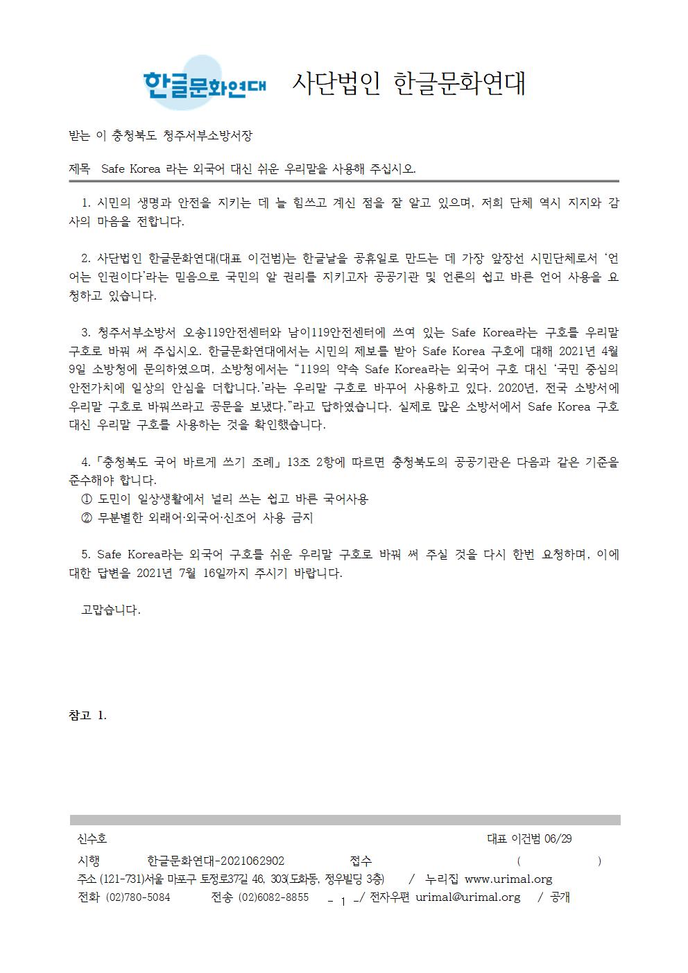 3. 청주서부소방서 오송119안전센터와 남이119안전센터에 쓰여 있는 Safe Korea라는 구호를 우리말 구호로 바꿔 써 주십시오. 한글문화연대에서는 시민의 제보를 받아 Safe Korea 구호에 대해 2021년 4월 9일 소방청에 문의하였으며, 소방청에서는 “119의 약속 Safe Korea라는 외국어 구호 대신 ‘국민 중심의 안전가치에 일상의 안심을 더합니다.’라는 우리말 구호로 바꾸어 사용하고 있다. 2020년, 전국 소방서에 우리말 구호로 바꿔쓰라고 공문을 보냈다.”라고 답하였습니다. 실제로 많은 소방서에서 Safe Korea 구호 대신 우리말 구호를 사용하는 것을 확인했습니다.