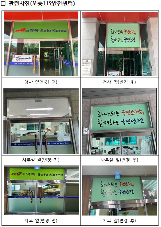 소방행정과-6228호(2021.07.07.)「청사 노후 시트지 교체(남이,오송)」와 관련하여 시트지 교체를 완료하였기에 붙임과 같이 보고합니다.