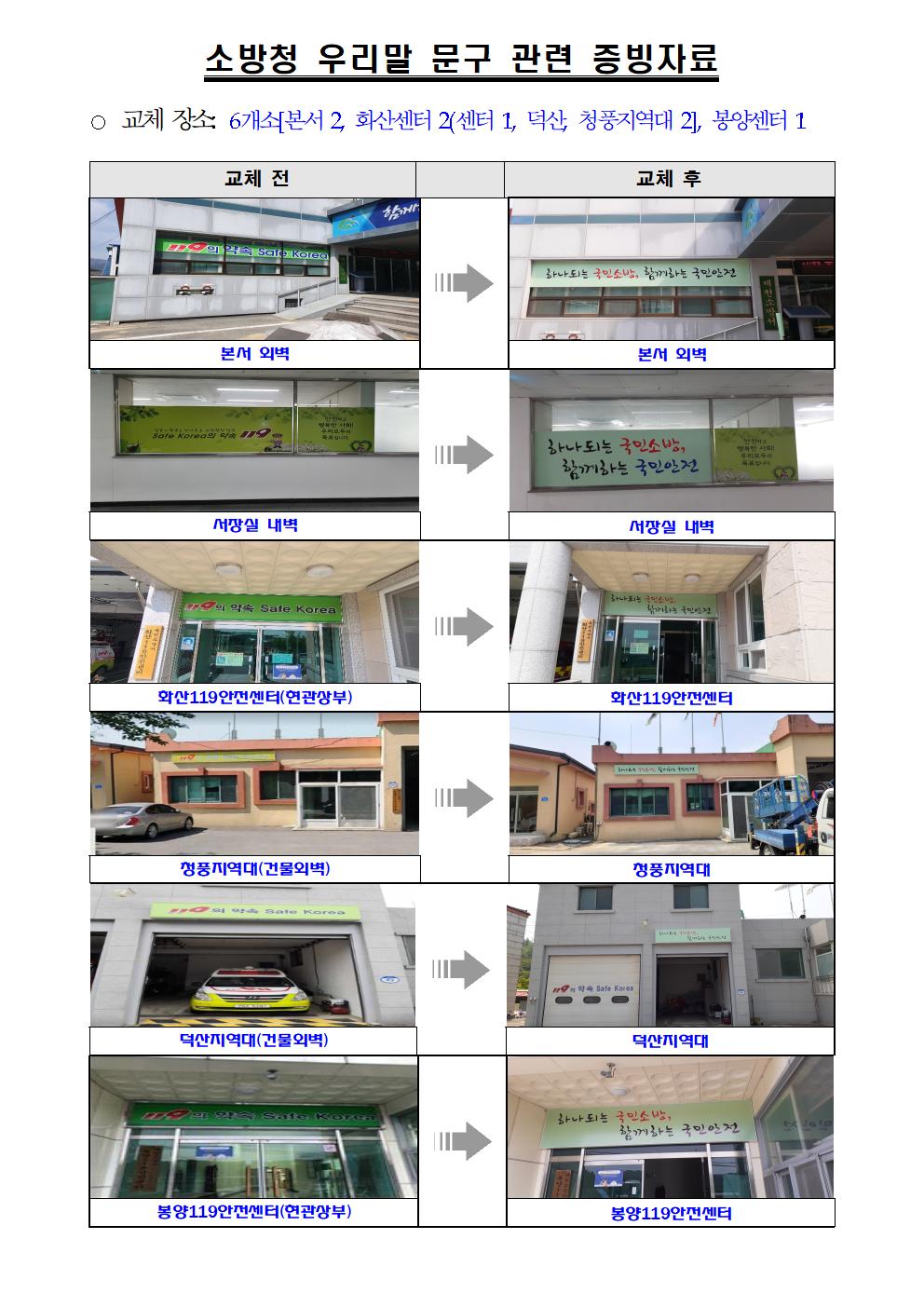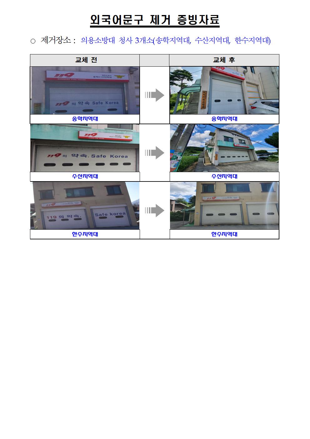 붙임 1. 소방청 우리말 문구 관련 결과보고 증빙자료 1부 2. 대상처별 외국어문구 제거 증빙자료 1부. 끝.