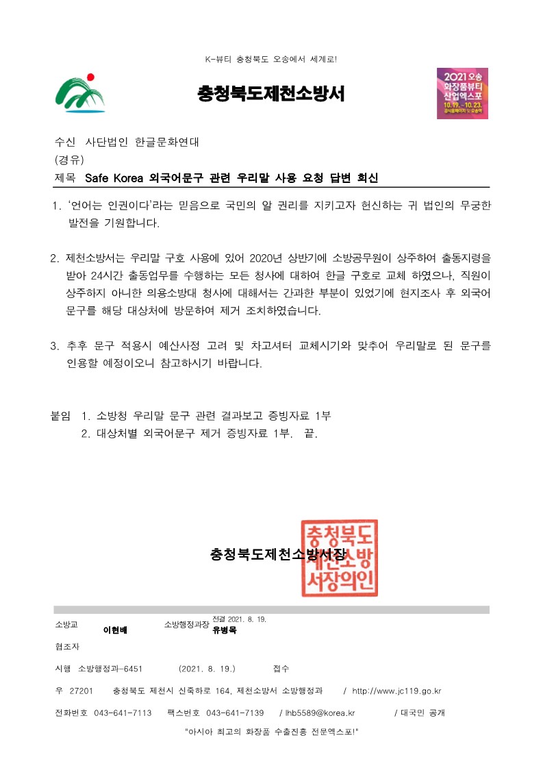 | [공문] Safe Korea라는 외국어 대신 쉬운 우리말을 사용해 주십시오. (0) | 2021.08.24 |