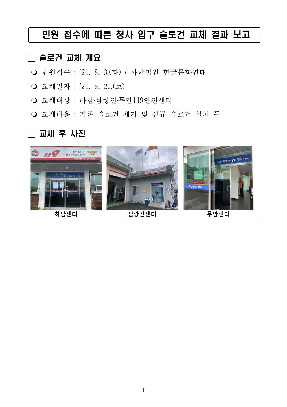 나. 소방행정과-10634('21. 8. 3.)호「민원 접수에 따른 청사 입구 슬로건 교체 계획」 다. 소방행정과-11161('21. 8. 13.)호「민원 접수에 따른 청사 입구 슬로건 교체 건의」