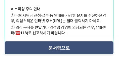 3. 행정안전부 국민비서 「국민지원금 대상자 여부 알림」 전자문서에 ‘스미싱 주의 안내’라는 외국어가 쓰인 것을 확인했습니다. 국민의 재산권을 침해하고 심지어 삶까지 앗아가는 범죄의 심각성을 바로 알리기 위해 스미싱 대신 문자 사기, 문자 결제 사기 등 쉬운 우리말로 바꿔 써 주십시오. 설명을 덧붙이지 않아도 누구나 의미를 쉽게 알고 범죄 피해를 줄일 수 있을 것입니다. 혹시라도 오해의 소지가 있다고 염려하신다면 ‘문자사기(스미싱)’라고 쓰셔도 좋습니다.