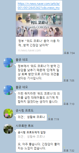 이중 김성수님은 "이미 국립국어원에서 위드코로나를 '코로나 일상'으로 재빠르게 바꿨지만 언론과 시민들의 호응이 별로 없는 점도 참고할 필요가 있습니다."라고 지적하며 투표하는 것을 동의했다.