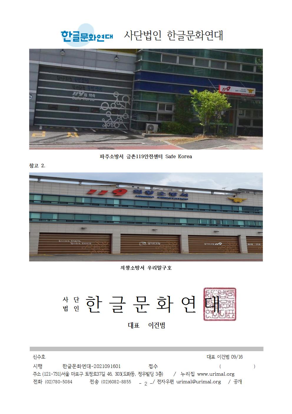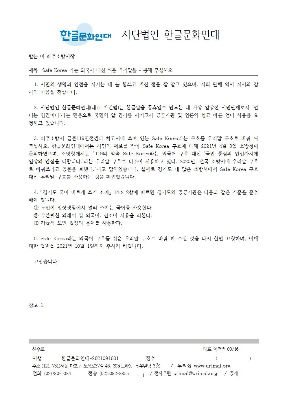 3. 파주소방서 금촌119안전센터 차고지에 쓰여 있는 Safe Korea라는 구호를 우리말 구호로 바꿔 써 주십시오. 한글문화연대에서는 시민의 제보를 받아 Safe Korea 구호에 대해 2021년 4월 9일 소방청에 문의하였으며, 소방청에서는 “119의 약속 Safe Korea라는 외국어 구호 대신 ‘국민 중심의 안전가치에 일상의 안심을 더합니다.’라는 우리말 구호로 바꾸어 사용하고 있다. 2020년, 전국 소방서에 우리말 구호로 바꿔쓰라고 공문을 보냈다.”라고 답하였습니다. 실제로 경기도 내 많은 소방서에서 Safe Korea 구호 대신 우리말 구호를 사용하는 것을 확인했습니다.