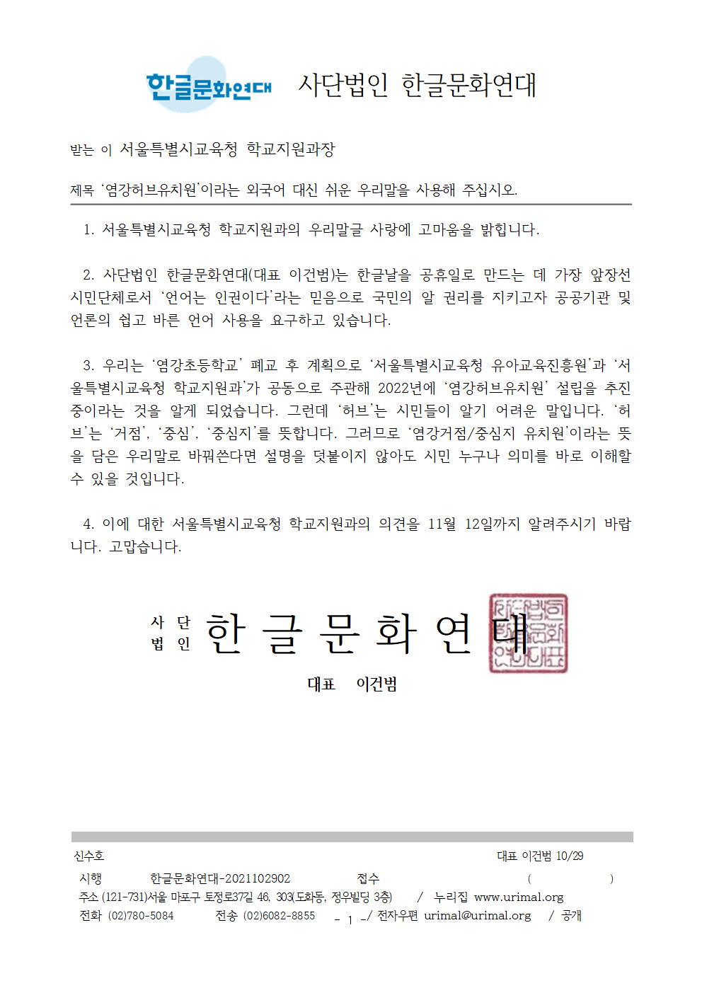 3. 우리는 염강초등학교폐교 후 계획으로 서울특별시교육청 유아교육진흥원서울특별시교육청 학교지원과가 공동으로 주관해 2022년에 염강허브유치원설립을 추진 중이라는 것을 알게 되었습니다. 그런데 허브는 시민들이 알기 어려운 말입니다. ‘허브거점’, ‘중심’, ‘중심지를 뜻합니다. 그러므로 염강거점/중심지 유치원이라는 뜻을 담은 우리말로 바꿔쓴다면 설명을 덧붙이지 않아도 시민 누구나 의미를 바로 이해할 수 있을 것입니다.