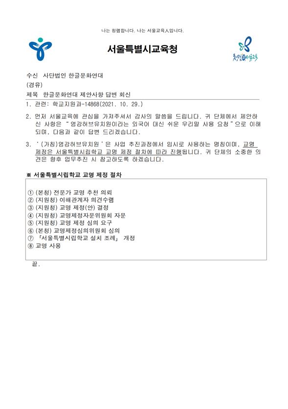 3. ‘ (가칭)염강허브유치원 ’ 은 사업 추진과정에서 임시로 사용하는 명칭이며, 교명 제정은 서울특별시립학교 교명 제정 절차에 따라 진행됩니다. 귀 단체의 소중한 의 견은 향후 업무추진 시 참고하도록 하겠습니다.