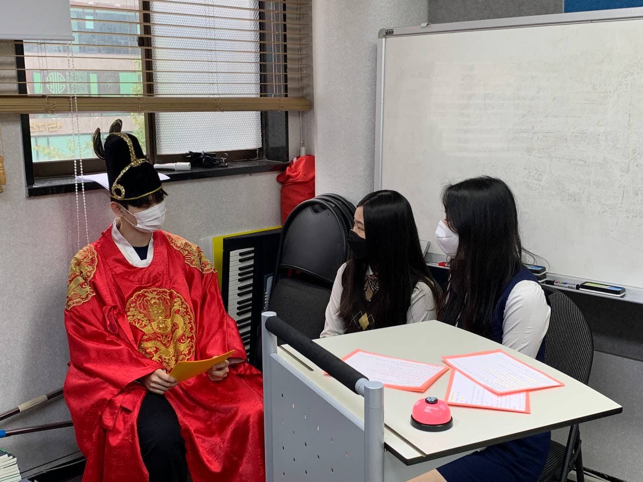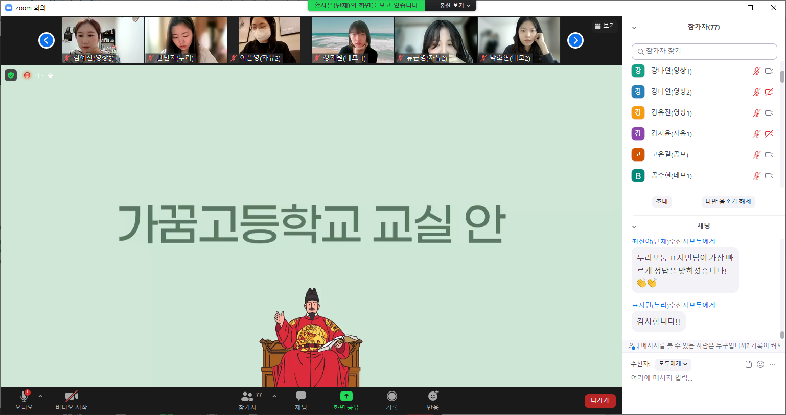 신조어와 줄임말을 남발하는 가꿈고등학교 학생들에게 세종대왕님이 등장해 한글과 한글날에 대해 강연을 해주셨답니다. 중간중간 아람 모둠장님이 깜짝 문제를 내면서 가꿈이들이 강연에 더 집중할 수 있도록 했습니다.