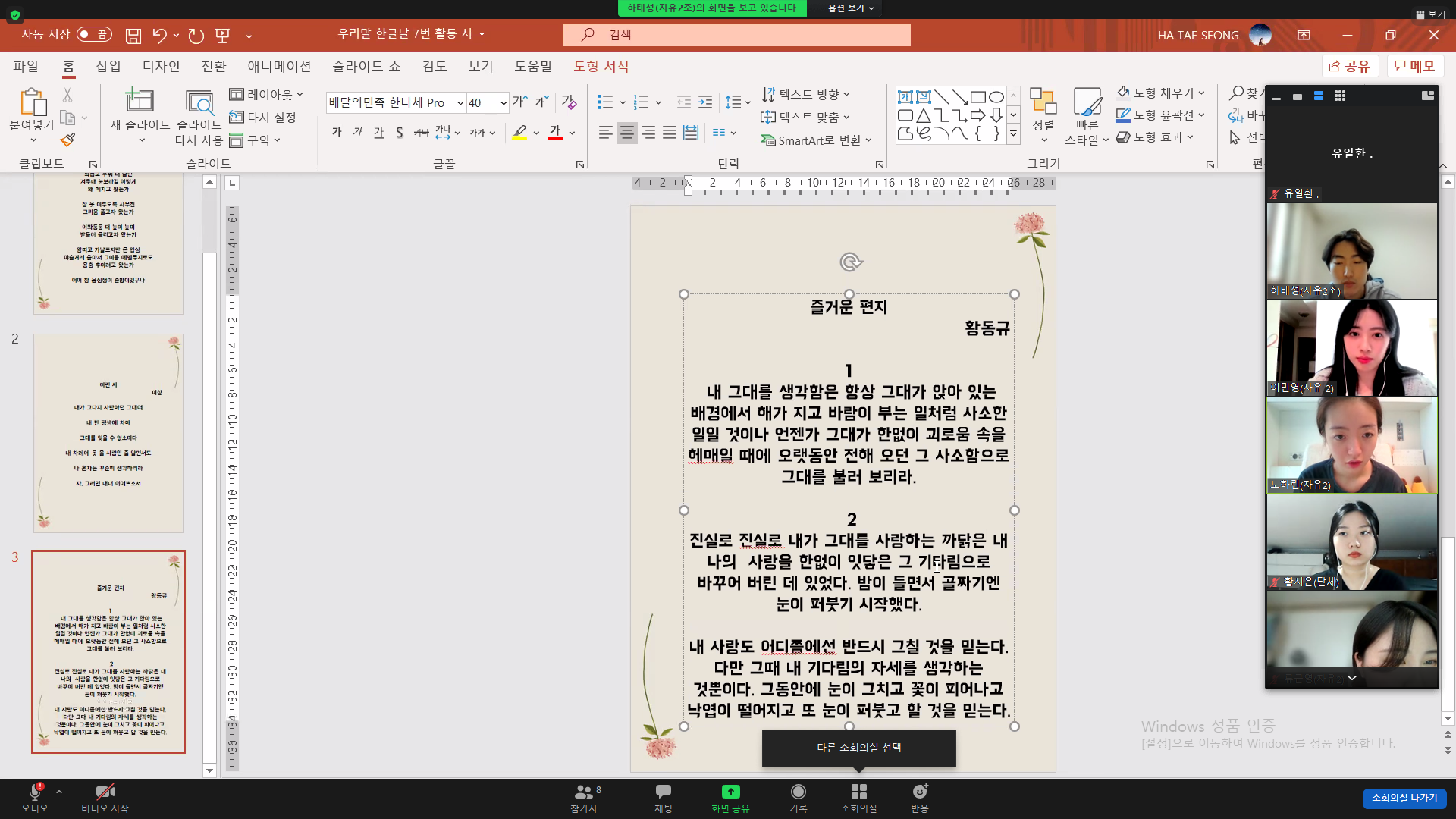4) 우리말 시 찾아 우리말 단어들 해석하기