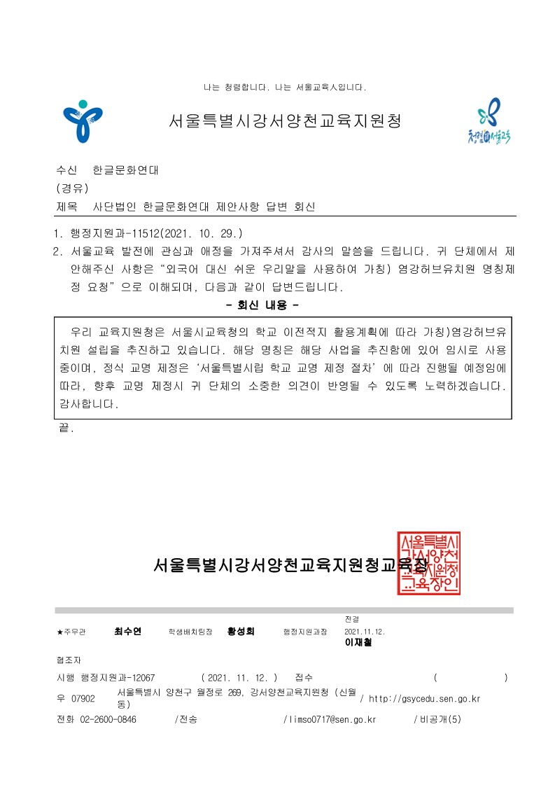 2. 서울교육 발전에 관심과 애정을 가져주셔서 감사의 말씀을 드립니다. 귀 단체에서 제 안해주신 사항은“외국어 대신 쉬운 우리말을 사용하여 가칭) 염강허브유치원 명칭제 정 요청”으로 이해되며, 다음과 같이 답변드립니다.