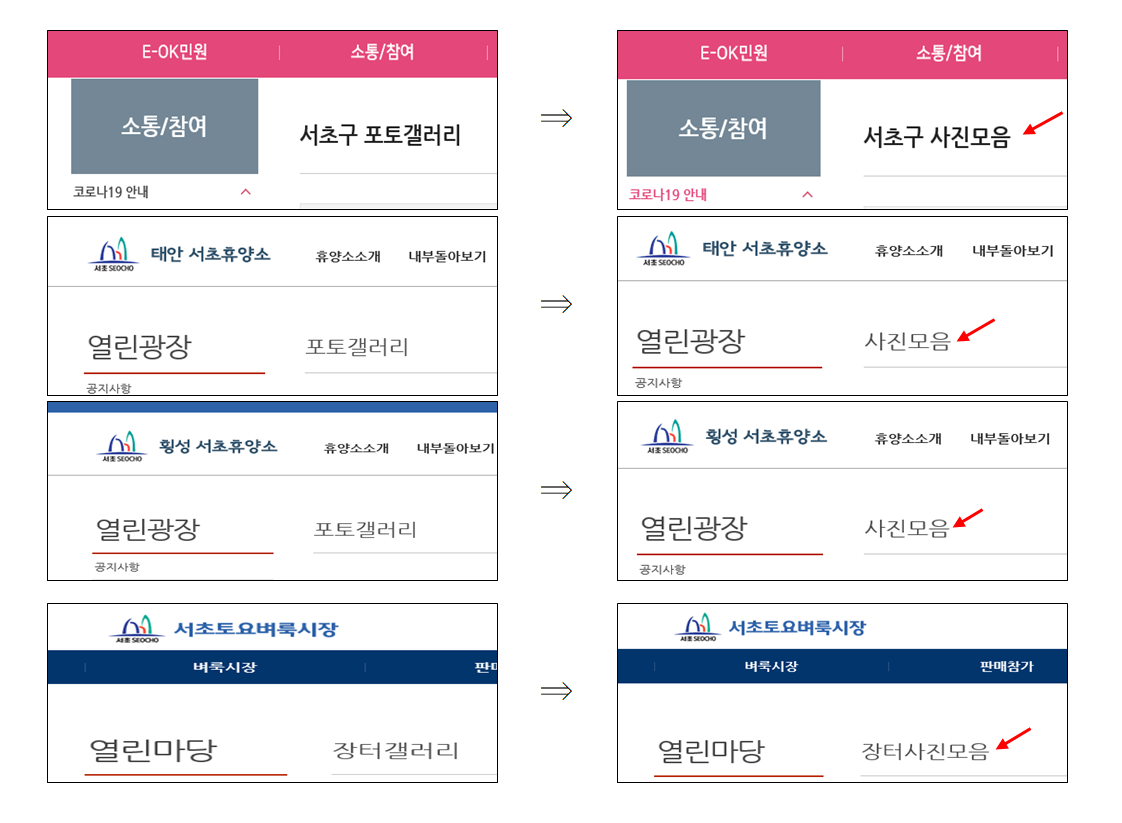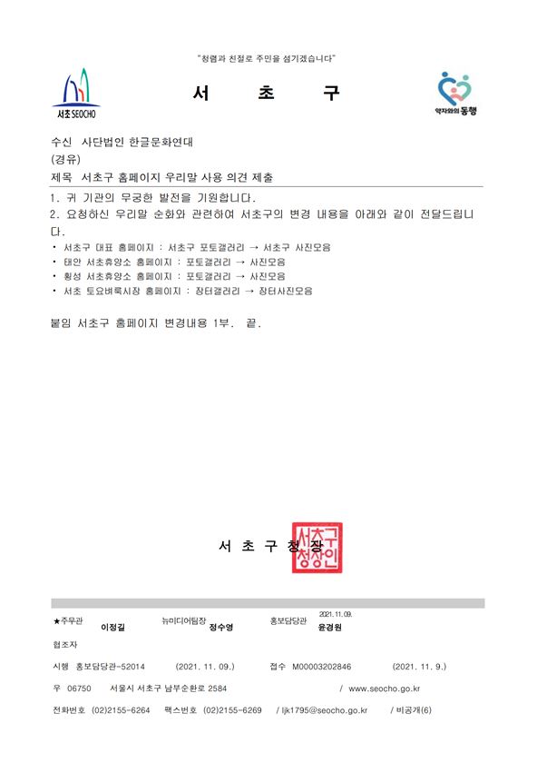 | [공문] 포토갤러리라는 외국어 대신 쉬운 우리말을 사용해 주십시오. - 2021.11.08 서울특별시 서초구 (0) | 2021.11.22 |