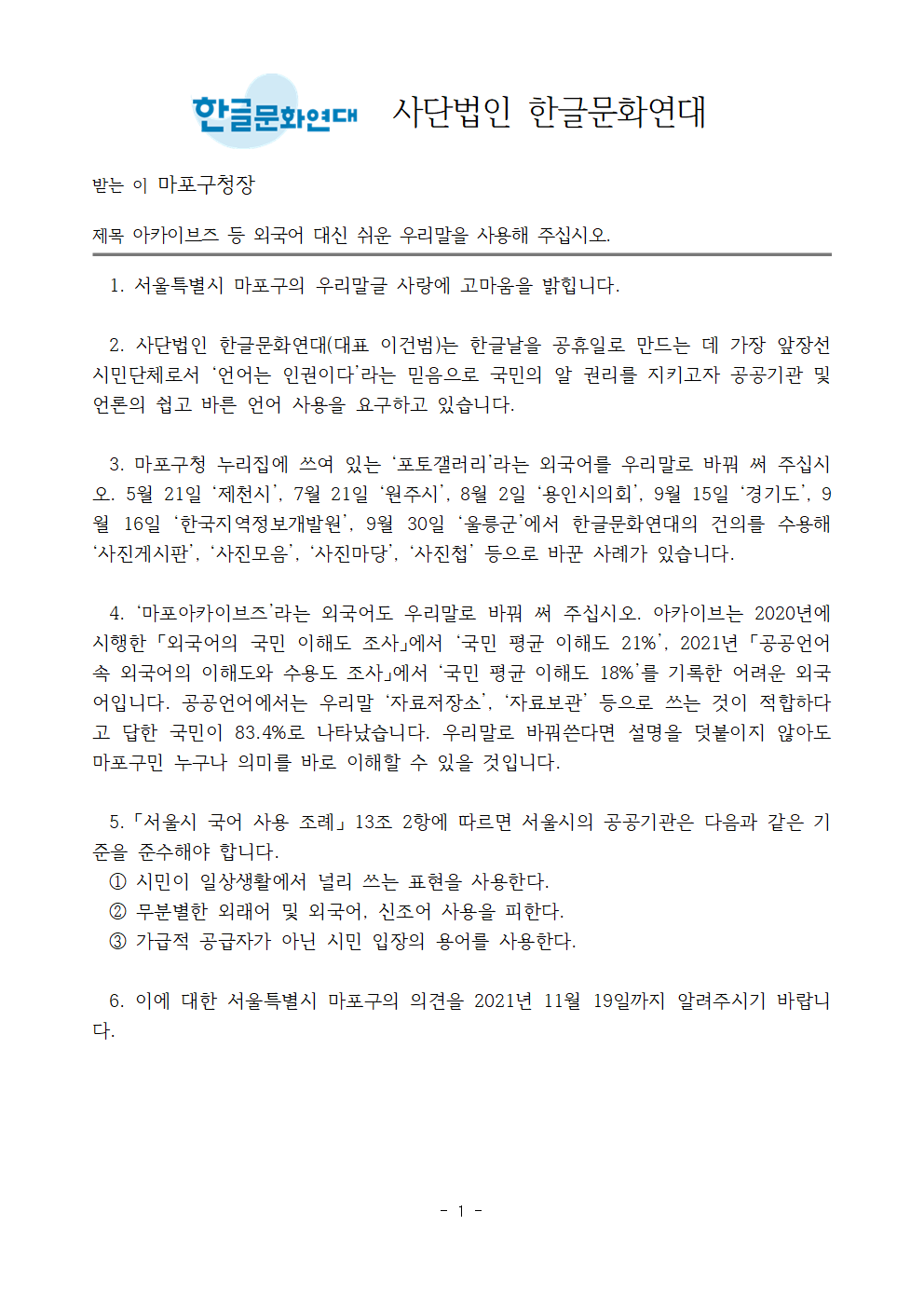 | [공문/답변] 아카이브즈 등 외국어 대신 쉬운 우리말을 사용해 주십시오. - 2021.11.23 서울특별시 마포구 (0) | 2021.11.23 |