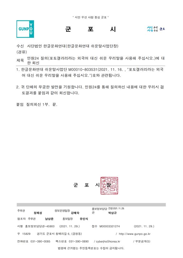 | [공문] 포토갤러리라는 외국어 대신 쉬운 우리말을 사용해 주십시오. - 2021.11.16 군포시 (0) | 2021.12.03 |